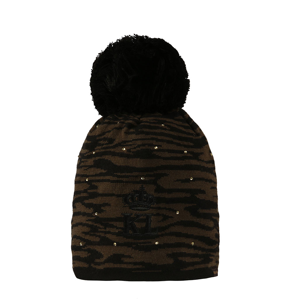Flachgestrickte Mütze mit Jacquardmuster und mit Glitzersteinchen reich verziert. Gleichfarbige Bommel aus Pompon-Garn sowie Kingsland-Aufnäher vorn.