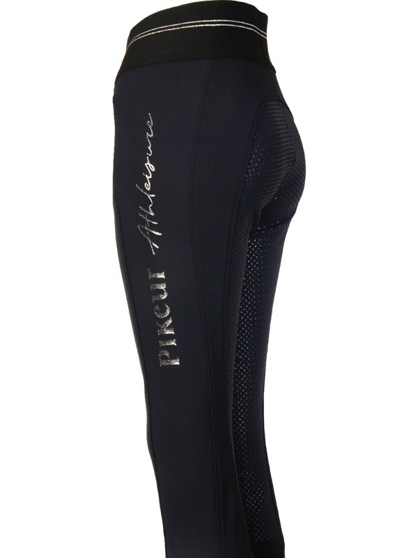 Sportliche Damen Reithose aus super elastischer, schweiss-absorbierender Funktionsware mit 3/4-Grip Besatz, Ton-in-Ton. Für ein ausgezeichnetes Tragegefühl sorgt die softig weiche Innenseite und der neuartige breite, elastische Formbund ohne Knopfverschluss. Mit seitlichen, nahtverdeckten RV-Taschen, einer Einschub-Handy-Tasche am rechten Oberschenkel und Pikeur-Athleisure-Glitter-Print seitlich links. Mit Kontrast-Glitzer-Streifen am Elastic-Bund. Der Beinabschluss ist aus elastischem Oberstoff gefertigt.